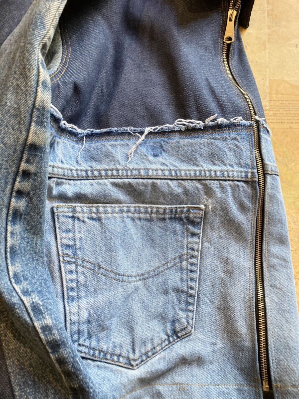 デニムパンツのバックポケットがフロントポケットになり、上下で違うデニム素材でカットオフで繋ぎ合わせているのも個人的にはグッとくるポイントです。