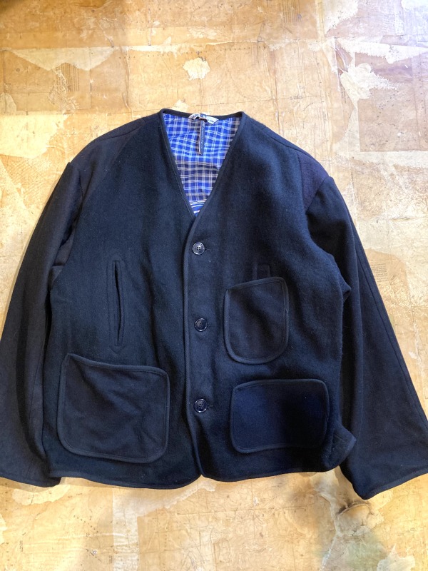 US NAVYのウールを使用して作られているのも久しぶりで新鮮です。それをエンジニアジャケットにリメイクしているのですが、ベースで使われているのがPコートなのでハンドウォームポケットがベースで付いてくる。その上からパッチポケットが重なって付いていたりしてリメイクならではの1点1点表情の変わるデザインに刺さるものがあります。ストリートブランド全盛期でPコートにエンジニアジャケットなんて久しく聞かなかったワードですが、ミリタリーやクラシックアメリカブームを通って来た自分としてはやっぱり惹かれてしまいます。ノーカラーのワイドな身幅と短な着丈はレイヤードするのに使えるアイテム。今、着たい気分です。