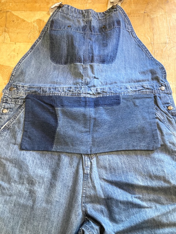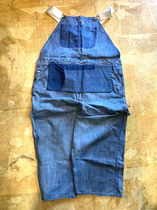 フロントポケットは排除して古着の色落ちのコントラストを出したり、後付けのウエストポケットはワークエプロンのようとこだわりのディテールがつまった遊び心あるオーバーオールです。