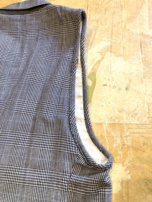 今回ご紹介のアイテムはテーラードベストです。古着のテーラードをリメイクして作られたこちらは、実際のテーラードを使用しているので仕立てが良くて品がある。それでいてレディースで見られるTシャツやシャツにニットとレイヤード出来るようにアームホールを大きくして肩幅も調節されているので、ちゃんとトレンドにハマっている。流石の仕上がりです。
